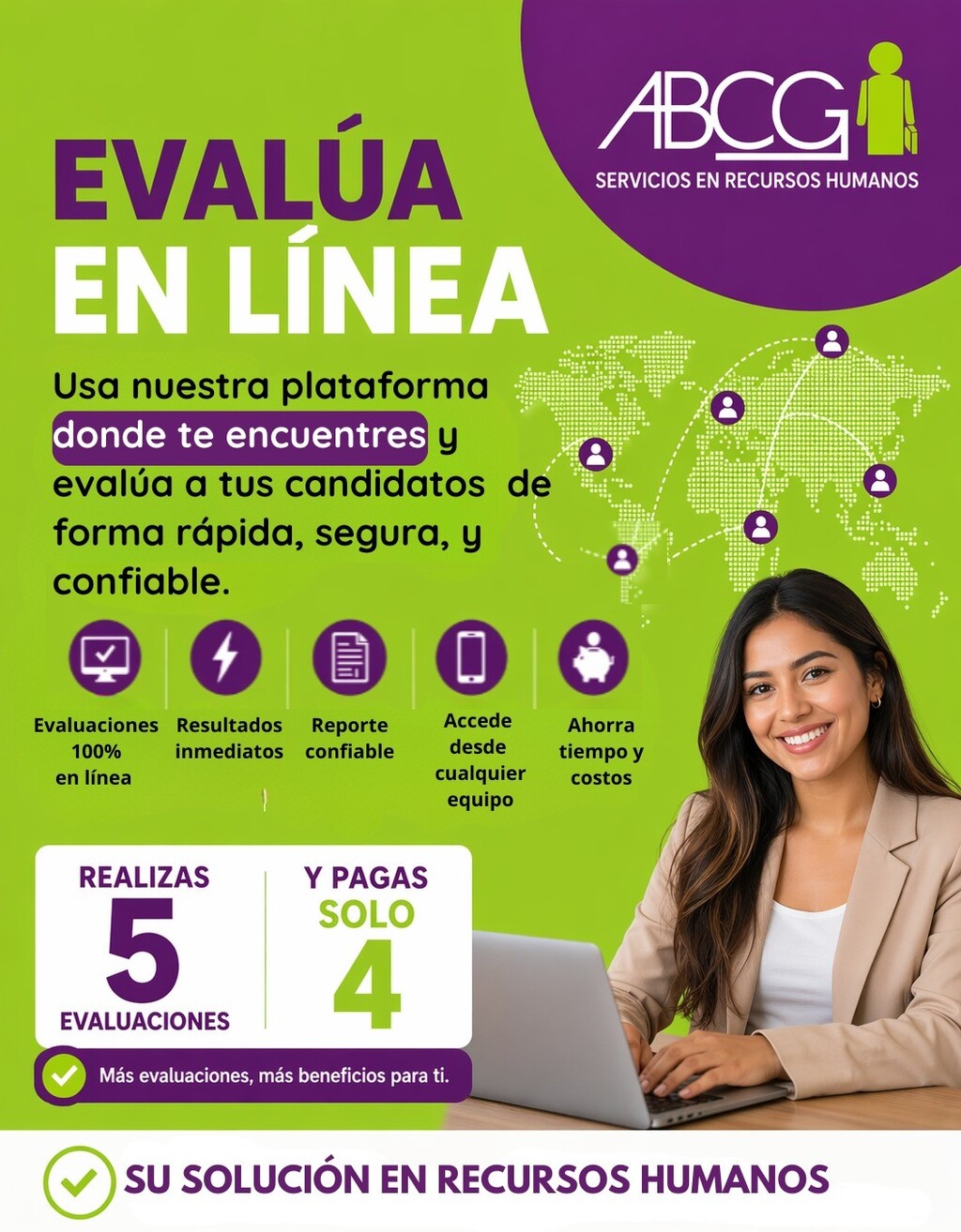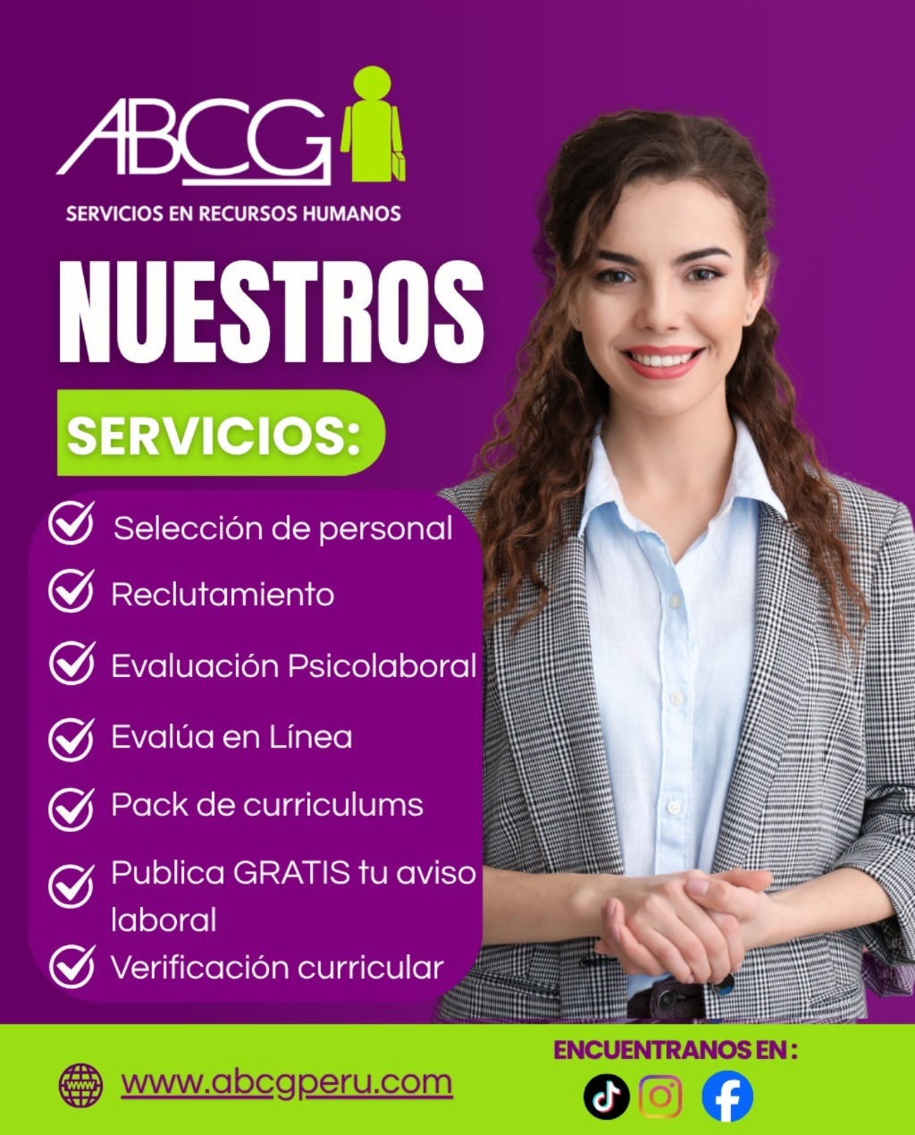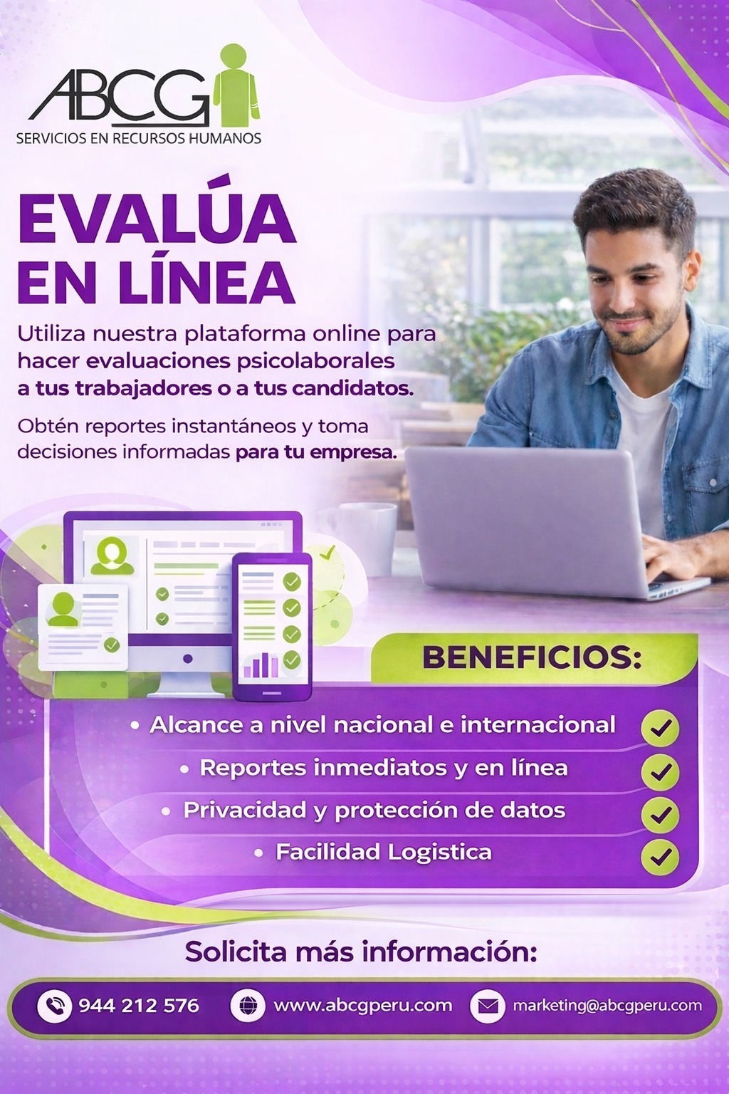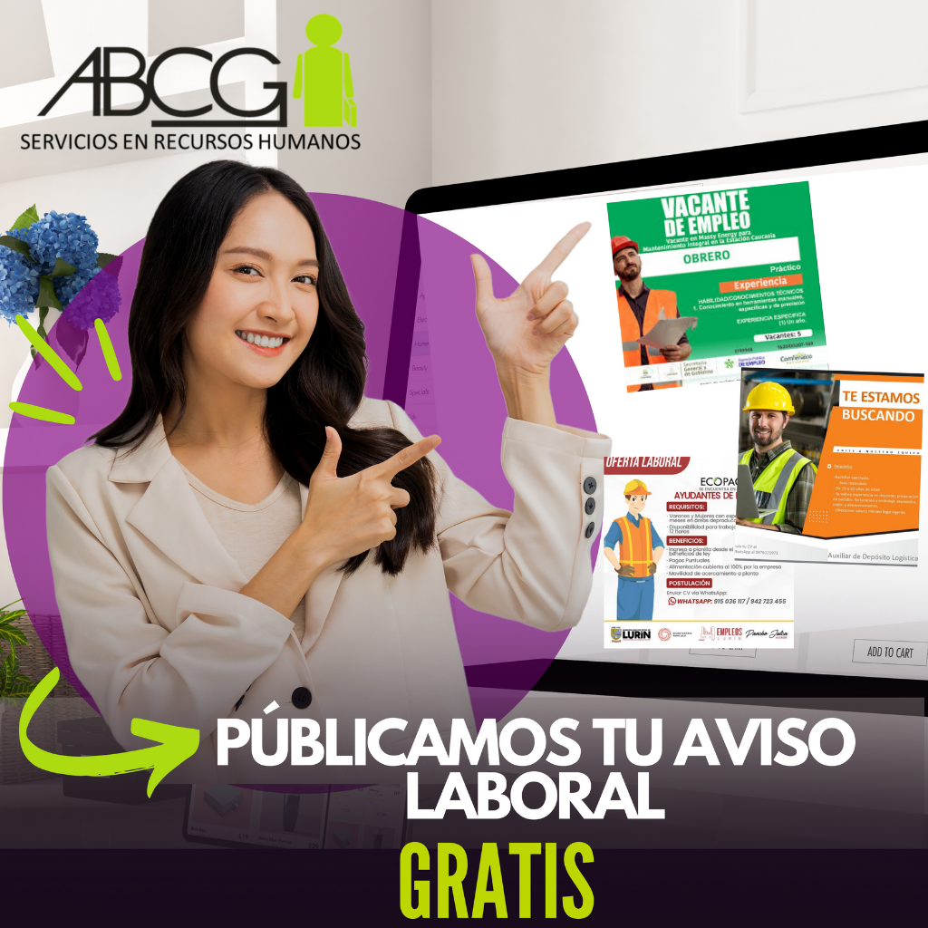 En ABCG Perú llevamos más de 25 años conectando empresas con el talento humano que necesitan. Brindamos soluciones de Recursos Humanos a nivel nacional e internacional, respaldados por experiencia y plataforma online propia, herramientas digitales y presenciales que garantizan: confianza, logística y tiempo.